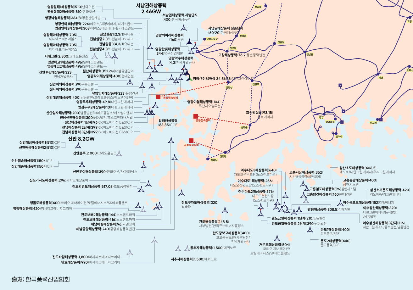 ▲ 전남 해상풍력 프로젝트 주요 추진 현황을 표시한 지도. ©한국풍력산업협회