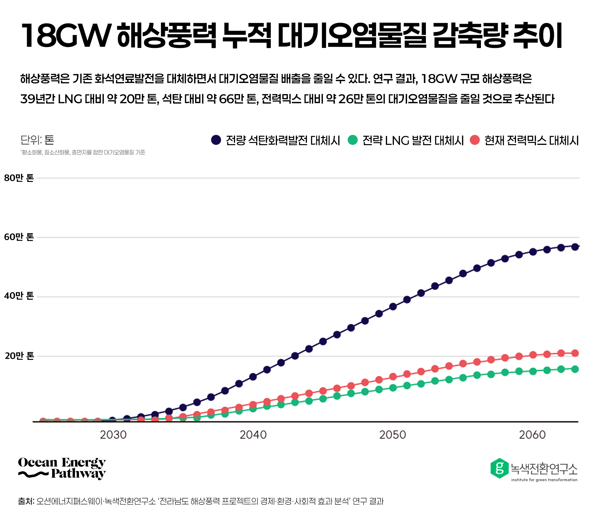 ▲ 18GW 규모 해상풍력 설비의 대기오염물질 감축량 추이 비교 그래프. ©녹색전환연구소